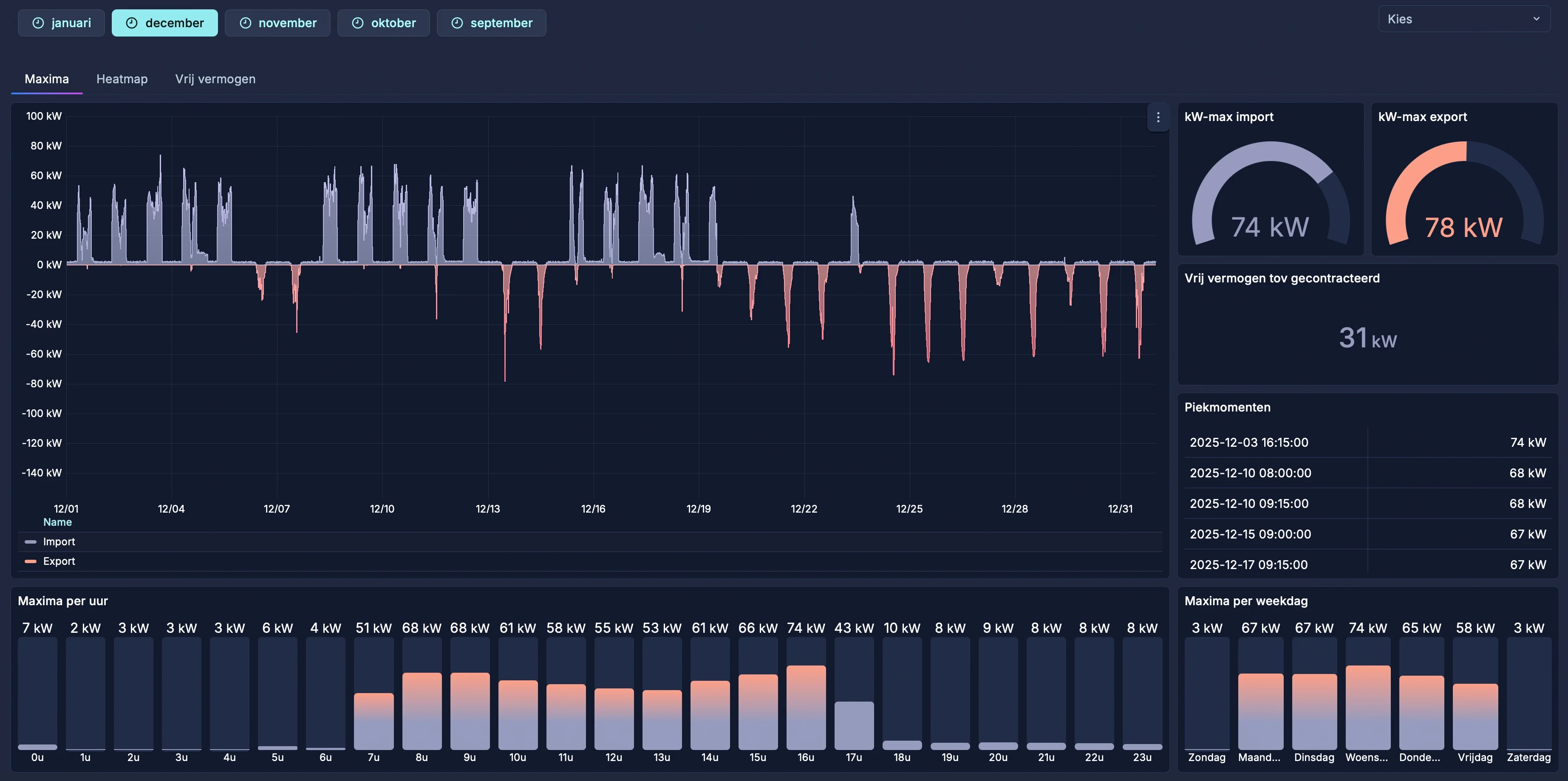 Om het bedrijf te helpen met inzicht in de belasting van de hoofdaansluiting hebben we een verbeterd kW-Max-dashboard ontwikkeld. In het dashboard zie je in één oogopslag op welke dagen en uren van de maand de hoogste kwartierwaarden hebben en hoeveel vrij vermogen er is ten opzichte van het gecontracteerd transportvermogen. Door in te zoomen op de pieken is direct te zien hoe deze tot stand komen. Tot nu blijkt hieruit dat er voldoende ruimte is voor de nieuwe lasersnijmachine en een investering in een accu niet noodzakelijk is om in het benodigde vermogen te voorzien.